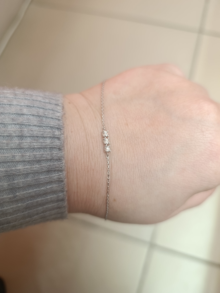 Элегантный браслет выполнен из белого золота 585 пробы и украшен тремя сверкающими бриллиантами