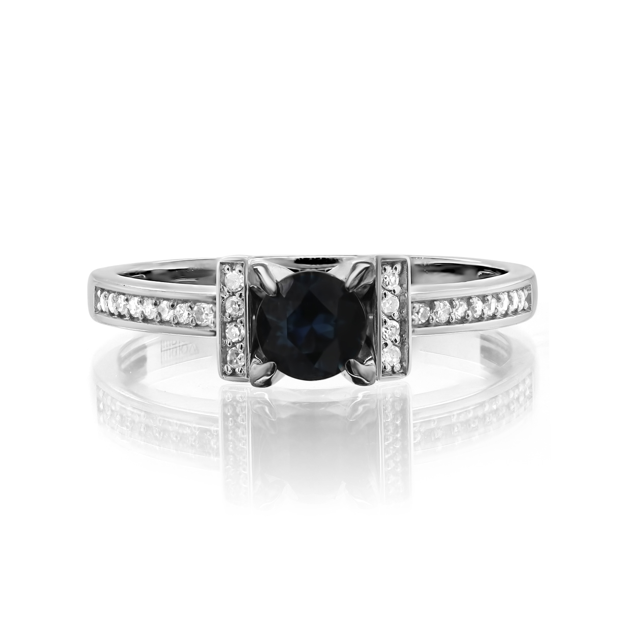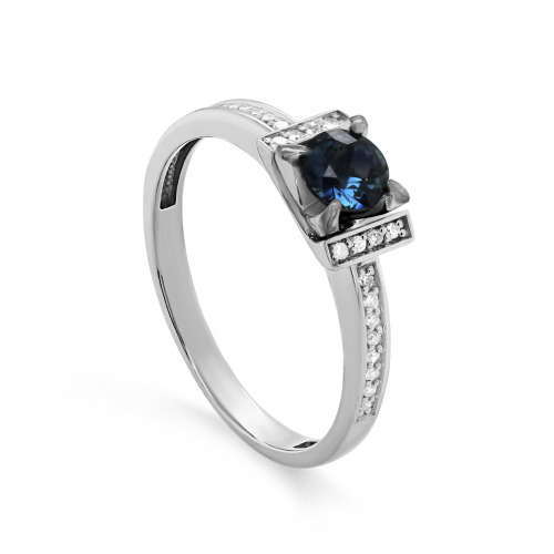 Элегантное кольцо выполнено из белого золота 585 пробы и украшено насыщенным иолитом и сверкающими бриллиантами