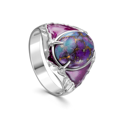 Изящное серебряное кольцо из 925 пробы украшено натуральным камнем бирюзой и цветной эмалью. Бирюза, расположенная в центре изделия, привлекает внимание своим нежным и насыщенным фиолетовым цветом, символизирующим удачу и гармонию. Эмаль подчеркивает красоту камня и добавляет кольцу яркости и выразительности. Простой и элегантный дизайн делает кольцо универсальным и подходящим для различных случаев. Такое кольцо станет прекрасным дополнением к вашему образу, подчеркивая вашу индивидуальность и утонченный вкус. Представлено брендом KABAROVSKY. Средняя характеристика камней: 1 Бирюза Овал кабошон 12,0х10,0 В комплект поставки входит: