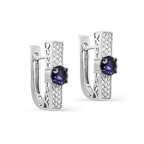 Серьги из белоснежного золота 585-й пробы впечатляют сочетанием природного блеска драгоценного металла, магнетизма глубокого цвета иолита и искрящегося света безупречных бриллиантов