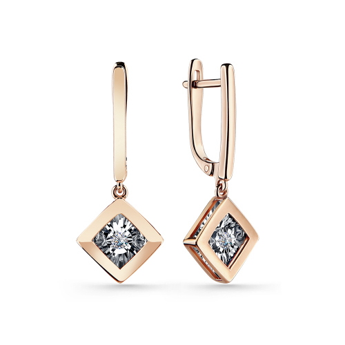 Оригинальные удлиненные серьги выполнены с сочетанием красного и белого золота 585 пробы в инкрустации сияющих бриллиантов
