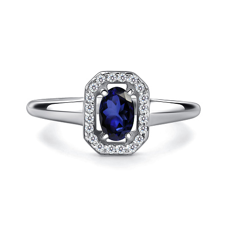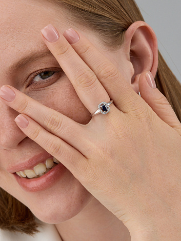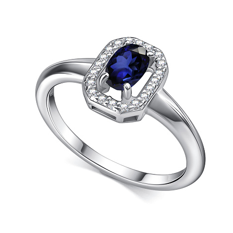 Элегантное кольцо из серебра 925 пробы с глубоким сапфиром и хрустальным блеском фианитов демонстрирует гармоничное сочетание цветов и фактур