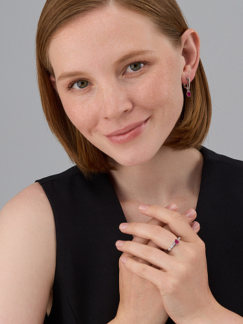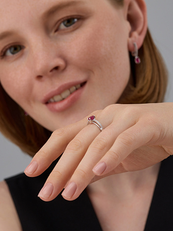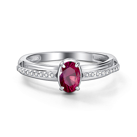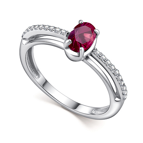 Эффектное кольцо из серебра 925 пробы с глубоким красным рубином и сверкающими фианитами привлекает внимание своим ярким дизайном
