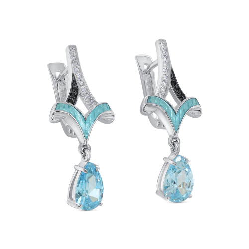 Потрясающие серебряные серьги из высококачественного 925 сплава с фантазийным дизайном, сочетающим лазурные голубые фианиты, контрастные белые и глубокие черные фианиты, дополнительно усилены легкой поверхностью из эмали