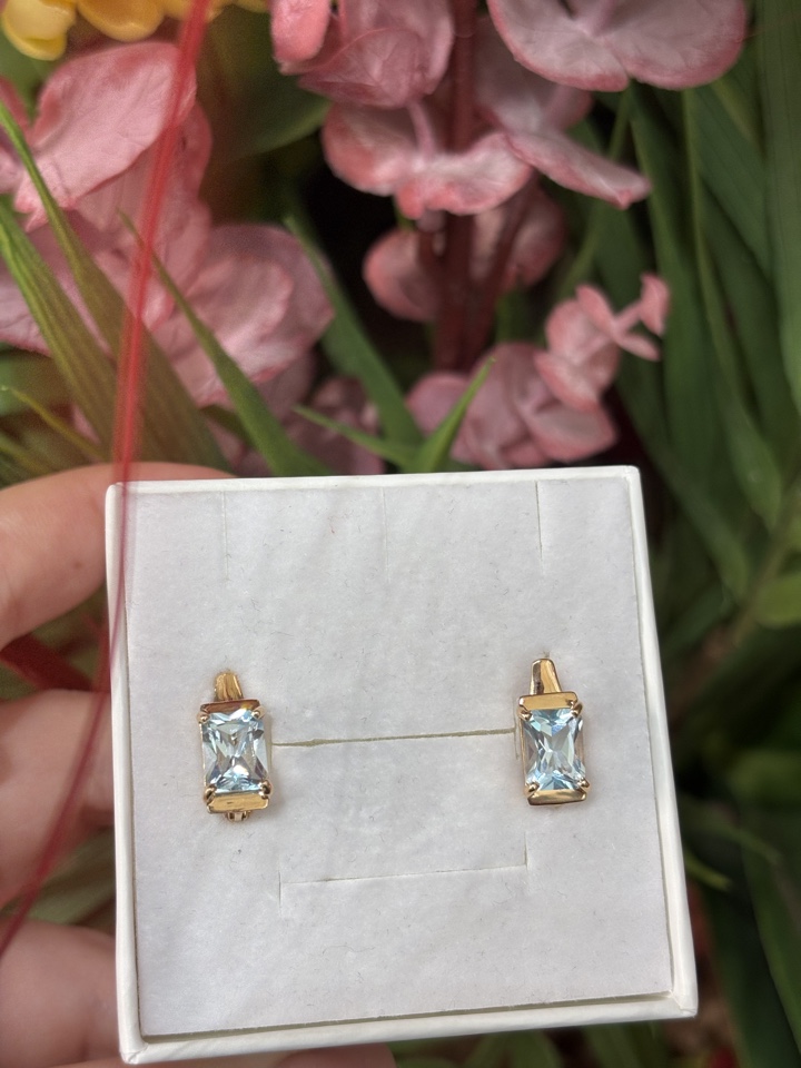 Современные, модные серьги выполнены из красного золота 585 пробы, украшены великолепными топазами голубого цвета