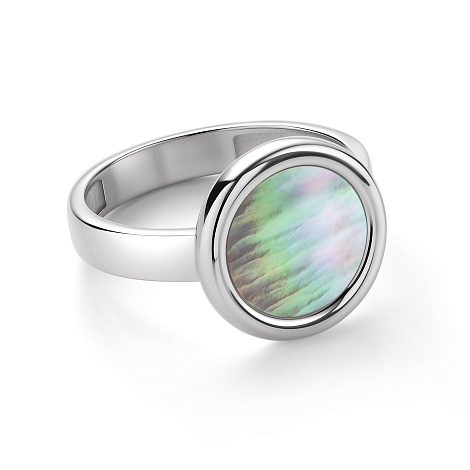 Кольцо с чёрным перламутром в касте круглой формы выполнено из родированного серебра 925 пробы