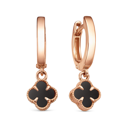 Эффектные удлинённые серьги выполнены в красном золоте 585 пробы и украшены черными ониксами