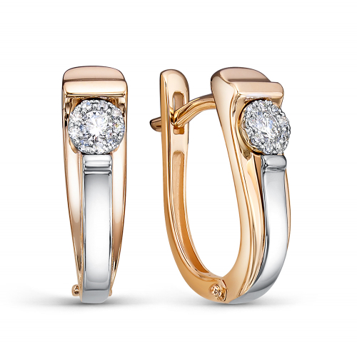 Серьги с сверкающими бриллиантами, блеск которых подчёркивают и усиливают бриллианты меньшего размера, выполнены из красного и белого золота 585 пробы