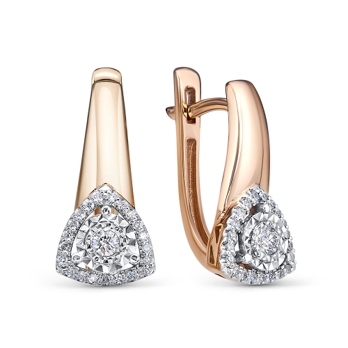 Серьги из красного и белого золота 585 пробы украшены россыпью бриллиантов на оригинальном касте из белого золота, который подчеркивает блеск и красоту камней