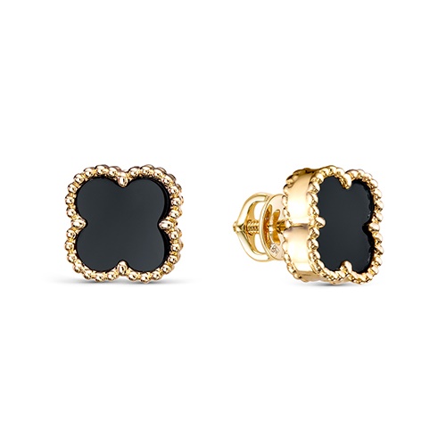 Серьги - пусеты в виде цветка с чёрным ониксом, выполнены из красного золота 585 пробы