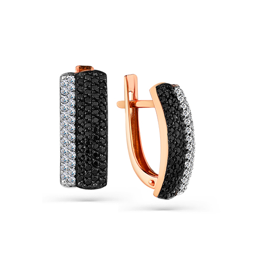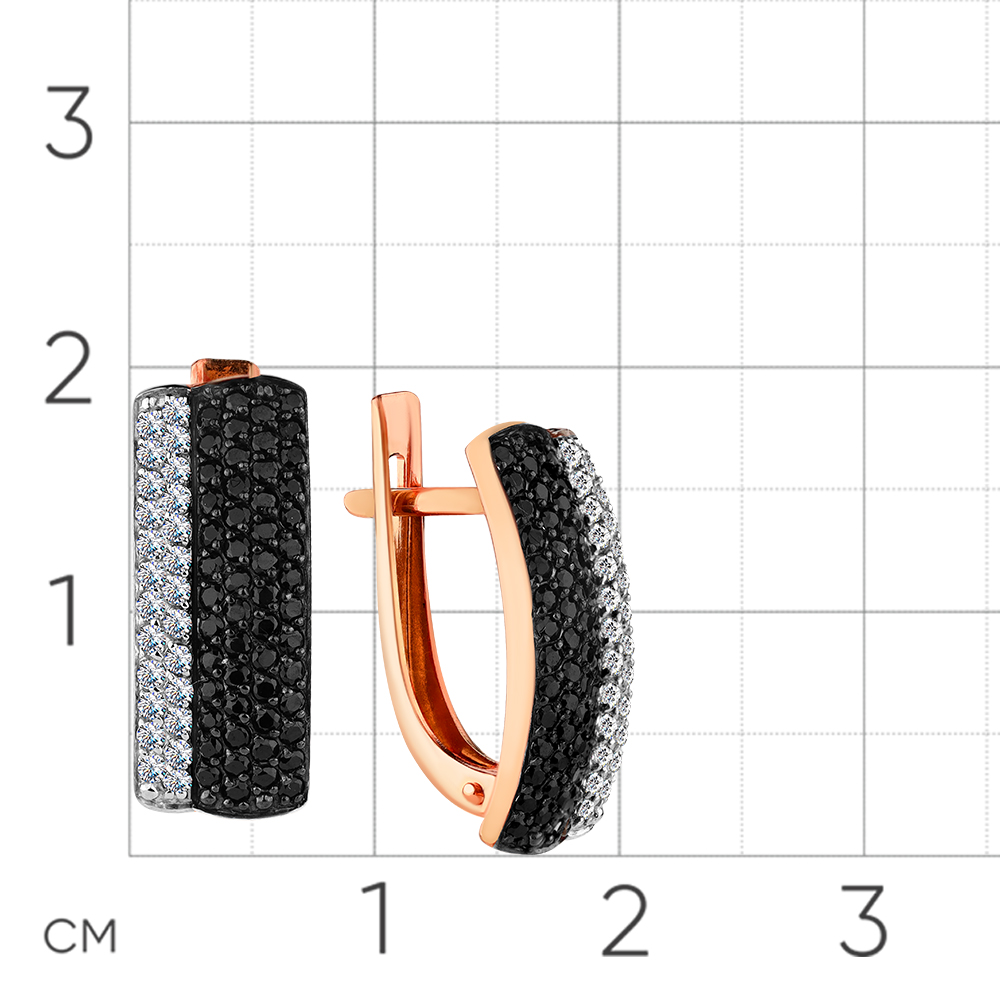 Серьги с оригинальным контрастным дизайном, украшенные чёрной шпинелью и сверкающими фианитами, выполнены с сочетанием красного и белого золота 585 пробы