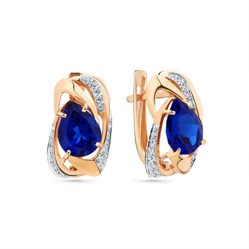 Изящные серьги с синими сапфирами в окружении сверкающих фианитов, выполнены в сочетании красного и белого золота 585 пробы. Серьги станут модной изюминкой в повседневном или деловом образе, а также стильно дополнят вечерний или коктейльный наряд. Тип замка - английская застежка, самый надежный и удобный. Изделие представлено брендом MAGIC STONES. В комплект поставки входит: