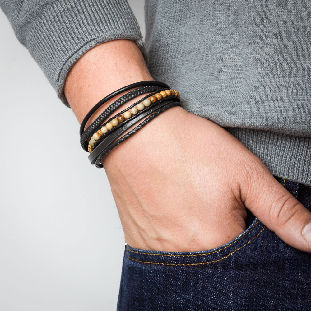Мужской кожаный браслет, дополненный стальным элементом. Эффектное дизайнерское сочетание кожи и агатов обращает на себя внимание именно тех мужчин, которые стремятся подчеркнуть свою индивидуальность и выделиться из толпы. Представлено брендом ANTON SMITH. В комплект поставки входит: