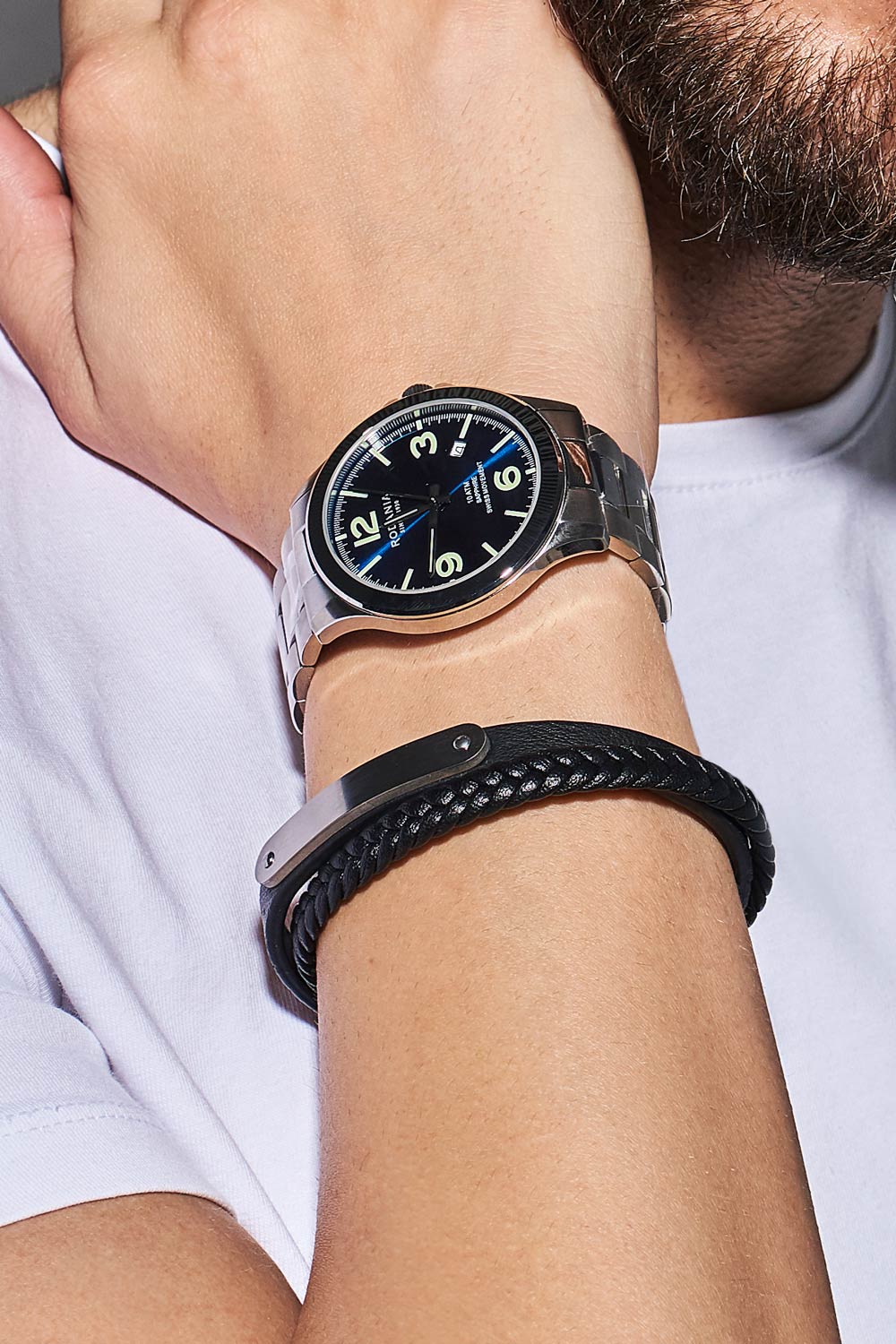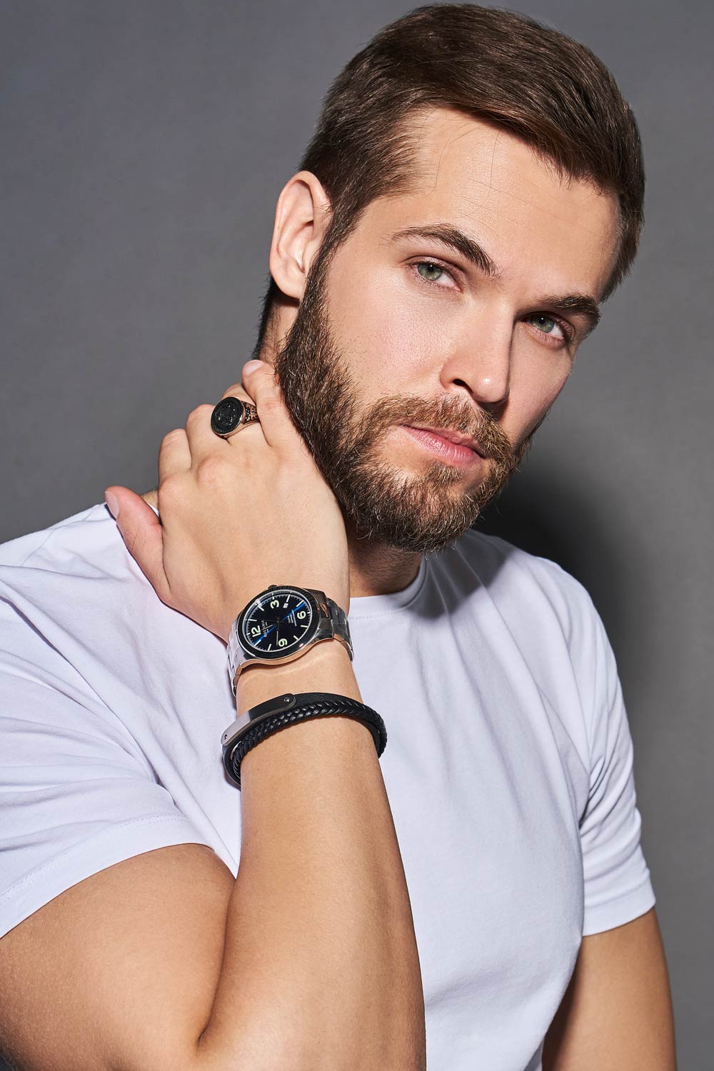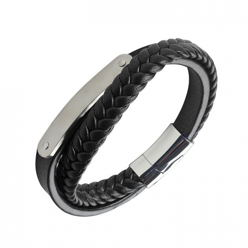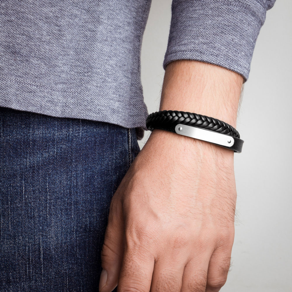 Стильный мужской браслет выполнен из натуральной кожи с сочетанием гладкой и плетеной текстуры, что придает ему особую привлекательность и выразительность