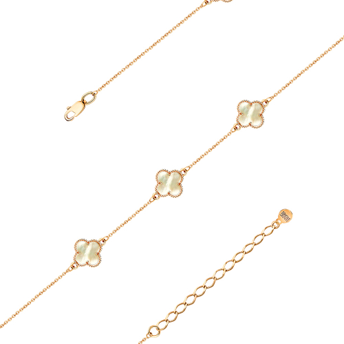 Цепочный браслет из красного золота 585 пробы с тремя оригинальными вставками в виде цветков, украшенных перламутром, — это воплощение нежности и элегантности