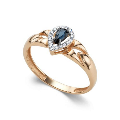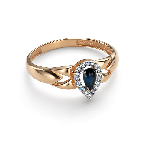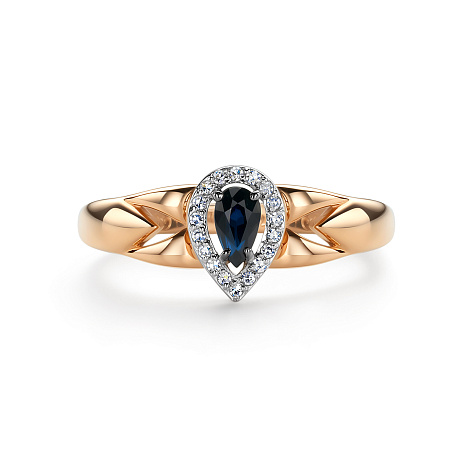 Роскошное кольцо, выполнено в сочетании красного и белого золота 585 пробы, с сапфиром тёмно-синего цвета и искрящейся россыпью бриллиантов. Изделие представлено брендом "Алькор". Средняя характеристика камней на артикул: 18 Бриллиант Круг 17 0.057 2/3, 1 Сапфир Груша 0.291 2/2 В комплект поставки входит: