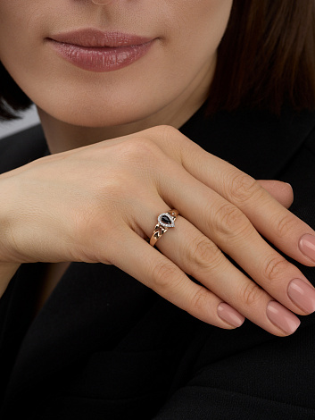 Роскошное кольцо, выполнено в сочетании красного и белого золота 585 пробы, с сапфиром тёмно-синего цвета и искрящейся россыпью бриллиантов