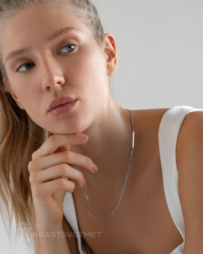 Стильное колье из плетения гурмета (d 0,5 мм) с акцентом в виде прямоугольной пластины (2,5х26 мм) выполнено из серебра 925 пробы. Длина регулируется за счет добора из одинарного сингапура (d 0,6 мм), длина добора 5 см. Замок карабин - прочный и надежный. Украшение покрыто металлом платиновой группы - родием, он защищает серебро от потемнения и придает искрящийся яркий блеск. Производитель Красцветмет предоставляет высокое качество продукции, цепи соответствуют международным стандартом и каждое украшение проходит дополнительный контроль качества при выходе с завода. В комплект поставки входит: