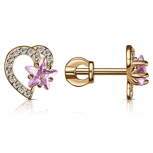 Нежные серьги-пусеты оригинального дизайна выполнены из красного золота 585 пробы, украшенные ярко-розовыми фианитами. Тип замка - винтовой, самый надежный и комфортный. Изящное украшение для романтичных натур. Изделие представлено брендом "VERONIKA". Средняя характеристика камней: 30 Фианит круг 0.9 б/ц, 2 Фианит звезда 5.0 розовый. В комплект поставки входит: