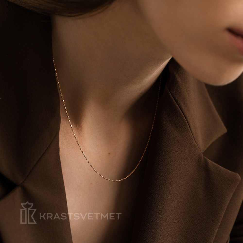 Яркая и оригинальная цепь из красного золота 585 пробы покоряет своим уникальным плетением из мелких шариков с бриллиантовым блеском