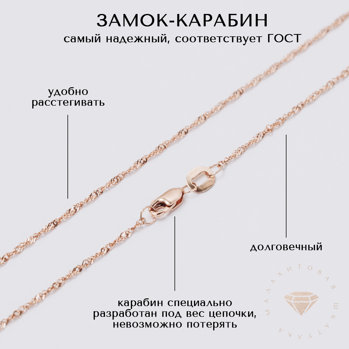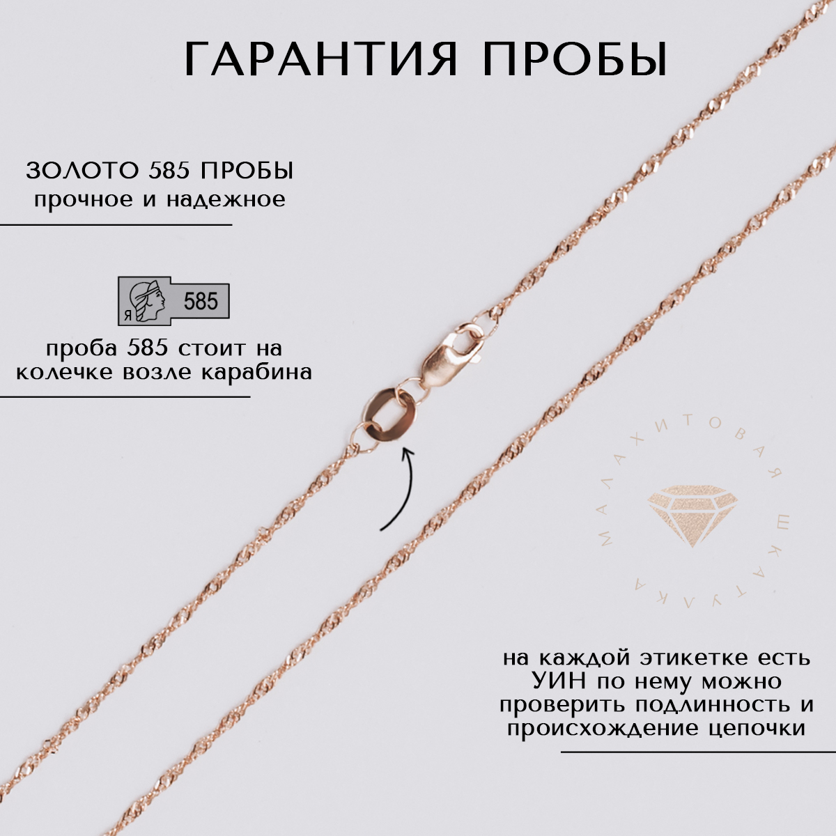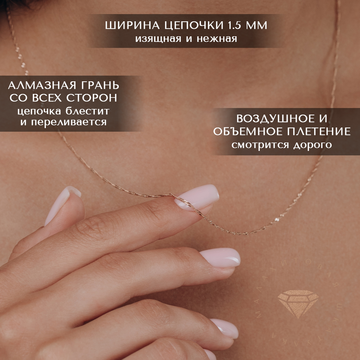 Цепочка очень красивая. Хотелось что-то нежное, изящное. Несмотря на то, что тоненькая, но вся сверкает за счёт алмазных граней. Большое спасибо производителю и магазину за качественный товар.