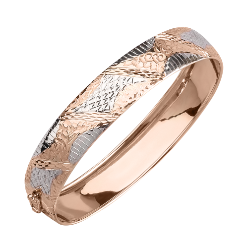 Жесткий женский браслет оригинального дизайна, выполненный из красного и белого золота 585 пробы, привлекает внимание благодаря эффектной обработке алмазной гранью