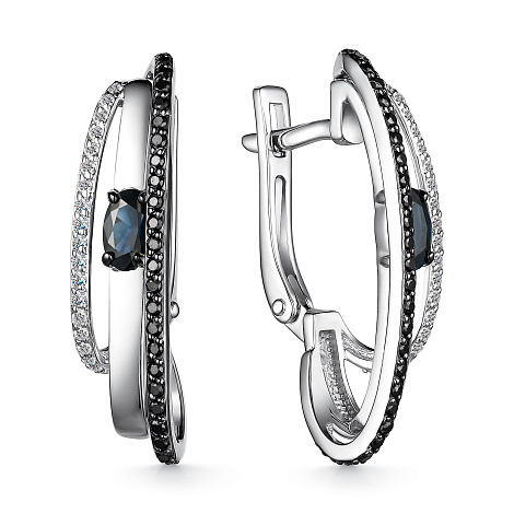 Роскошные серьги из коллекции Magic colors, выполнены из белого золота 585 пробы, украшены великолепными темно-синими сапфирами между сияющих дорожек безцветных и черных бриллиантов