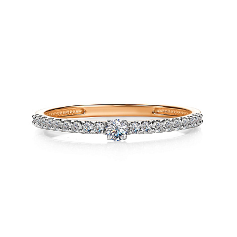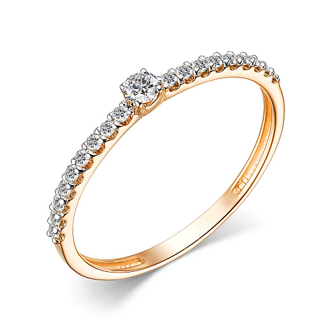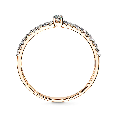 Изящное кольцо с бриллиантом в центре, красоту которого подчёркивает дорожка меньших по размеру бриллиантов, выполнено из красного золота 585 пробы