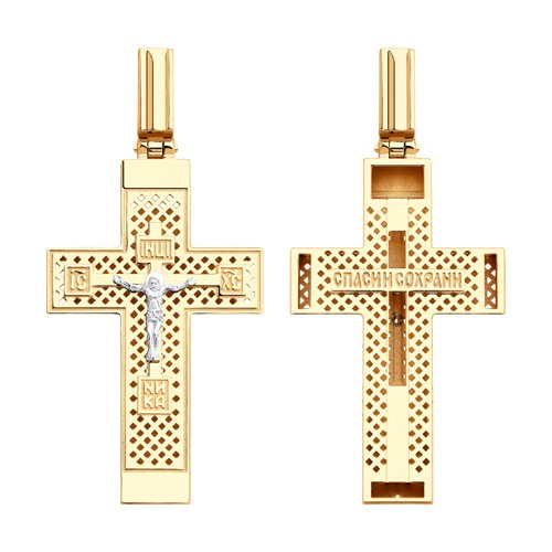Православный крест выполнен в сочетании красного и белого золота 585 пробы, в нем исполнены все каноны Православной Церкви, на внешней стороне креста распятие, на обороте надпись "спаси и сохрани". В комплект поставки входит: