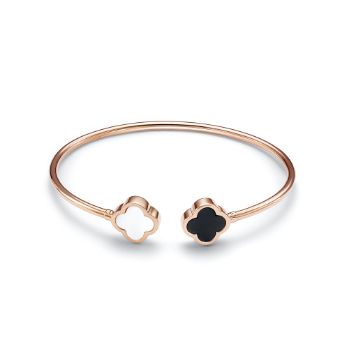 Жёсткий женский браслет, украшенный вставками с чёрным и белым ониксом, выполнен из красного золота 585 пробы