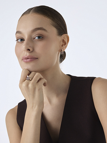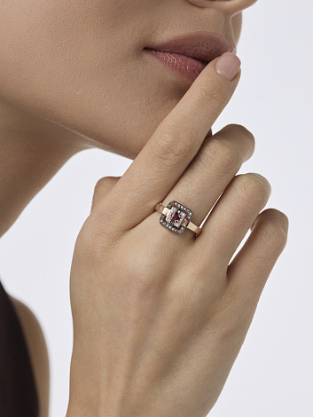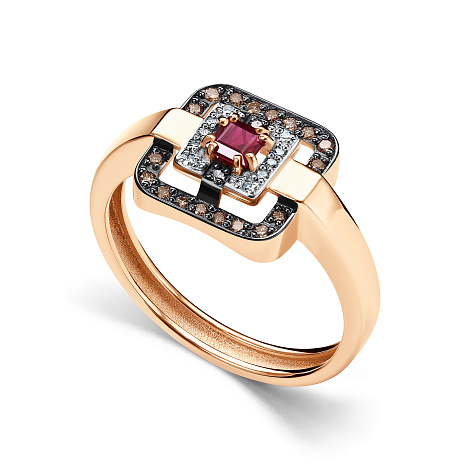 Красивое кольцо из красного золота демонстрирует богатую палитру натуральных материалов: рубин и коньячные бриллианты создают уникальный цветовой ансамбль