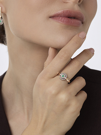 Кольцо из красного золота обладает приятным теплом естественного металла, служащего основой для удивительного дуэта камней