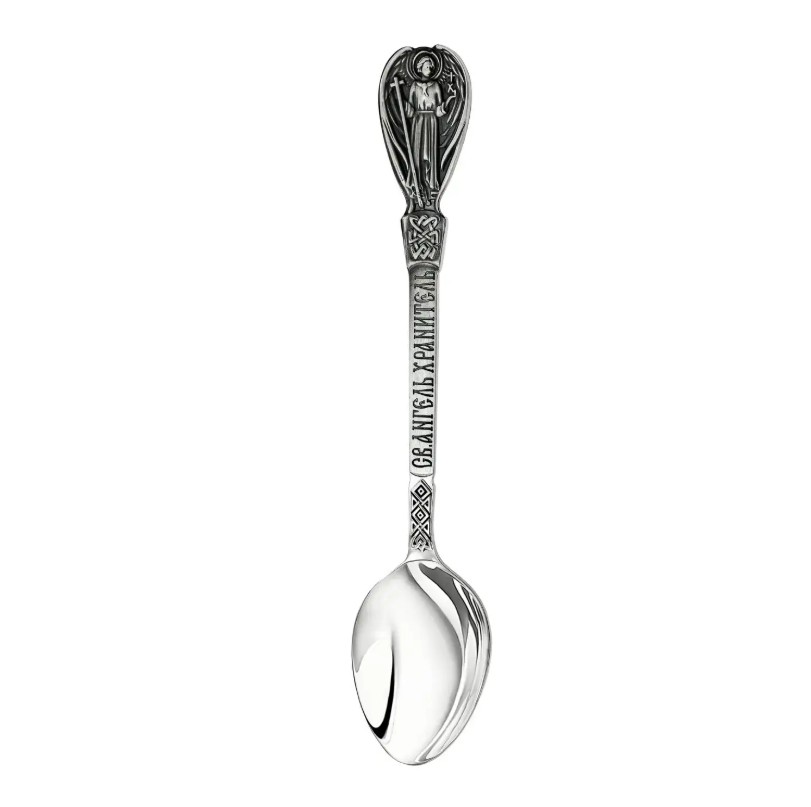 Ложка «Святой Ангел» выполнена из качественного серебра 925 пробы и украшена изящным чернением