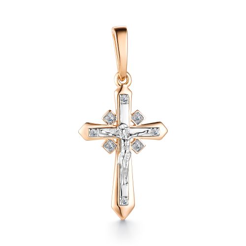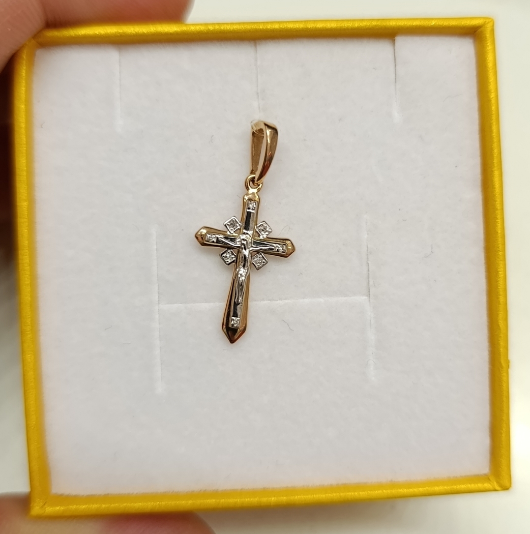 Подвеска в форме крестика выполнена в сочетании красного и белого золота 585 пробы