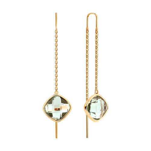 Удлиненные серьги-протяжки выполнены из благородного красного золота 585 пробы, украшенного зелеными празиолитами