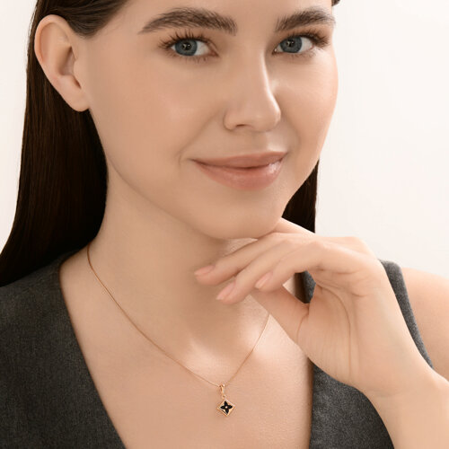 Подвеска выполнена из красного золота 585 пробы, которое придает изделию благородный оттенок и подчеркивает его элегантность. Центральным элементом подвески является черный оникс, заключенный в форме четырехлистного клевера, символизирующего удачу и благополучие. Оникс обладает богатой историей и мистическими свойствами, укрепляя связь с природой и заряжая положительными эмоциями. Это украшение станет отличным выбором для тех, кто ищет стильное и оригинальное дополнение к своему образу. Представлено брендом SOKOLOV. Средняя характеристика камней: 1 × Оникс недраг Черный Квадрат плоский с отв. 6.00*6.00 ~0,472 кар В комплект поставки входит: