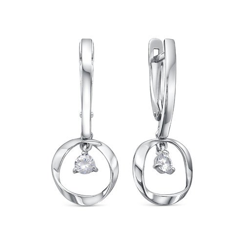 Серьги с подвеской круглой формы, украшенной сверкающим фианитом, выполнены из родированного серебра 925 пробы