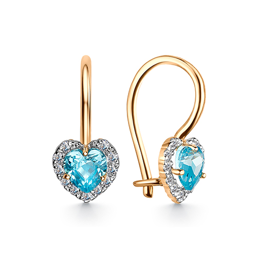 Детские серьги украшены голубыми фианитами в виде сердечек, красоту которых подчёркивают дорожки фианитов, выполнены с сочетанием красного и белого золота 585 пробы