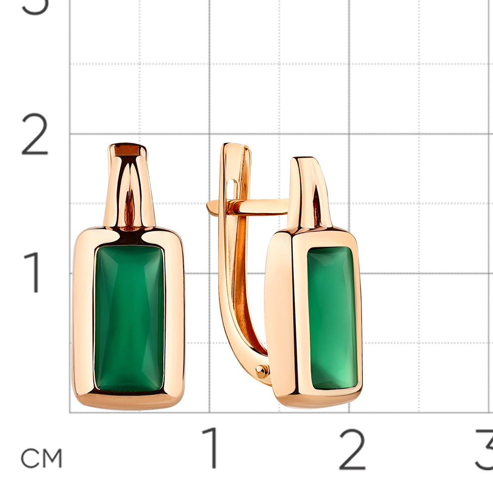Стильные лаконичные серьги с зеленым агатом огранки багет, выполнены из красного золота 585 пробы