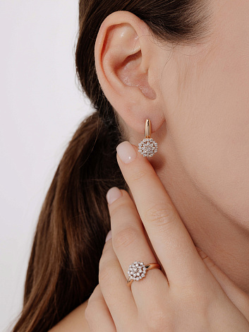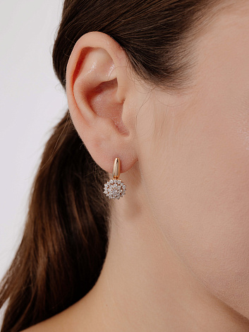 Элегантные серьги с сверкающими бриллиантами в изящном касте круглой формы, выполнены с сочетанием красного и белого золота 585 пробы