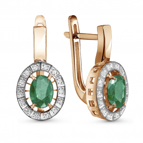 Элегантные серьги выполнены из благородного сочетания красного и белого золота 585 пробы, украшенные сверкающими бриллиантами и роскошными изумрудами