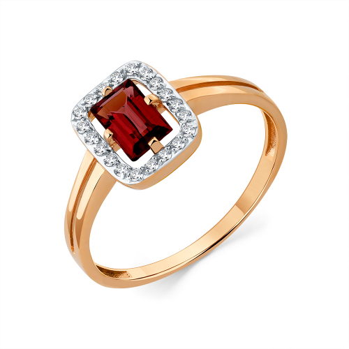 Элегантное кольцо выполнено из благородного сочетания красного и белого золота 585 пробы, украшено сверкающими фианитами и ярким гранатом