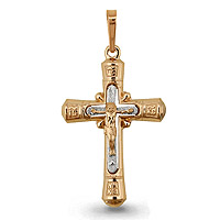 Крест, в котором исполнены все каноны Православной Церкви, выполнен в сочетании красного и белого золота 585 пробы.