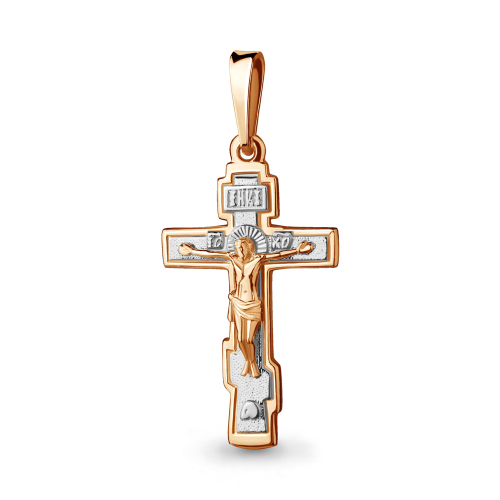 Прямой, лаконичный православный крест для мужчины или женщины, выполнен в сочетании красного и белого золота 585 пробы, в нем исполнены все каноны православной церкви, на внешней стороне креста распятие, на обороте надпись "спаси и сохрани