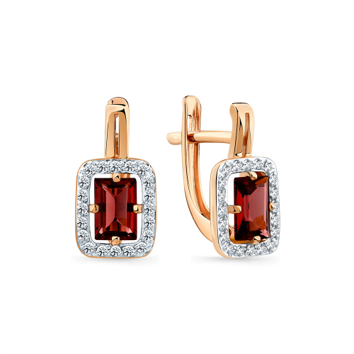 Элегантные серьги выполнены из благородного сочетания красного и белого золота 585 пробы, украшенные сверкающими фианитами и яркими гранатами