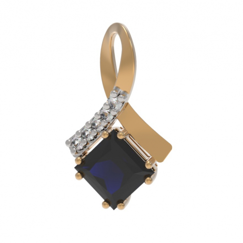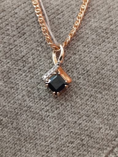 Элегантная подвеска выполнена из красного золота 585 пробы и украшена сияющим сапфиром и бриллиантами