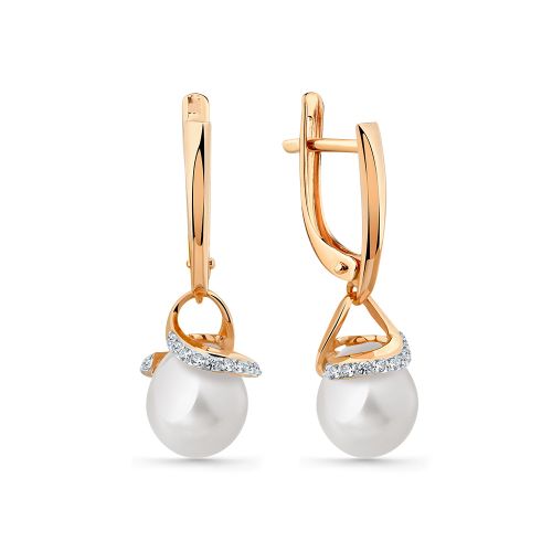 Красивые удлинённые серьги из красного и белого золота с натуральным жемчугом и блестящими фианитами