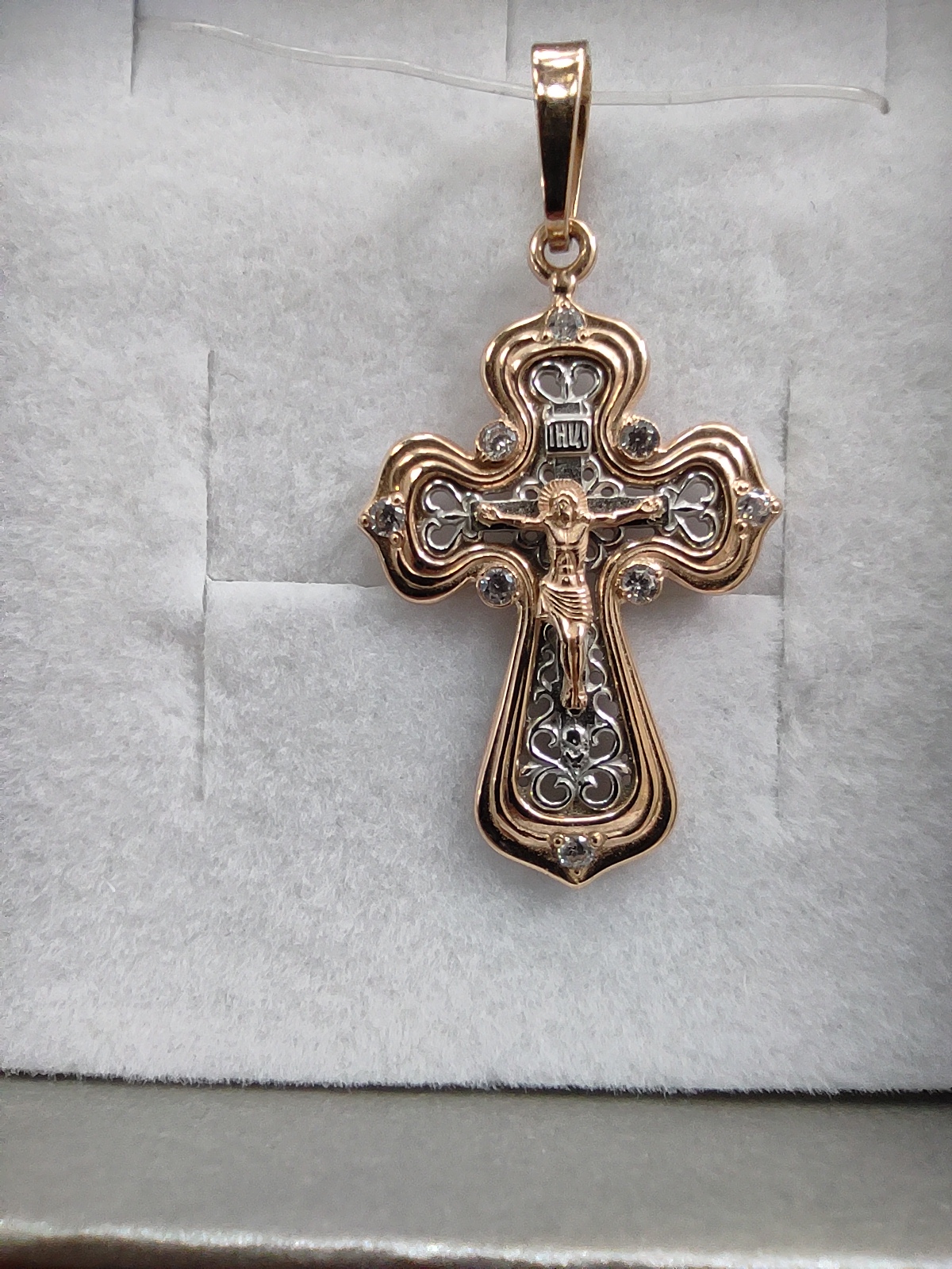 Православный крест, в котором исполнены все каноны Православной Церкви, выполнен в сочетании красного и белого золота 585 пробы, украшен россыпью фианитов
