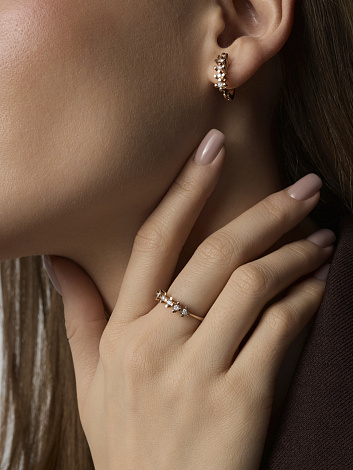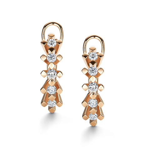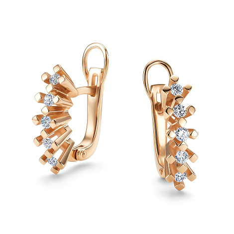 Изящные серьги выполнены из теплого красного золота 585 пробы и дополнены сияющими бриллиантами