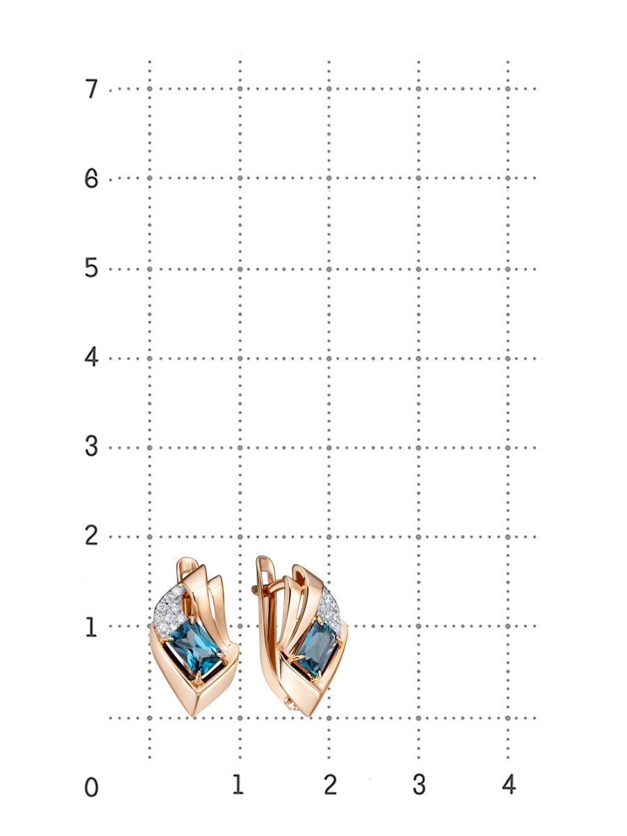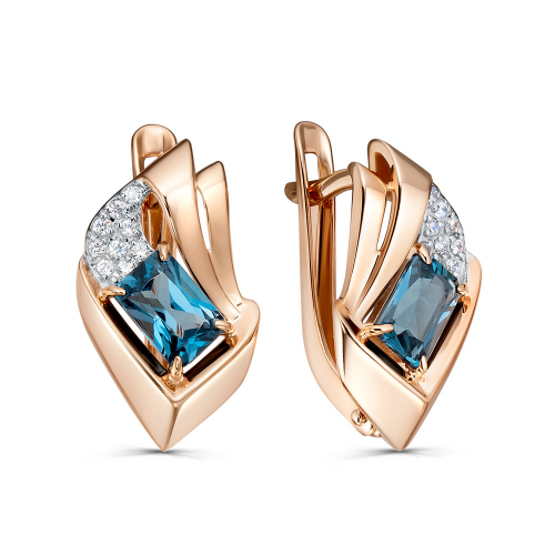 Элегантные серьги из благородного красного и белого золота 585 пробы украшены топазами лондон и изысканными фианитами. Разнообразие цветов и фактур создает увлекательный визуальный эффект, который подчеркнет вашу индивидуальность и чувство стиля. Представлено брендом ROSE GRACE. Средняя характеристика камней: 2 Топ. Лонд. Октагон 6,00х4,00 - 1,266 ct.; 18 Фианит Кр 1,00 В комплект поставки входит: